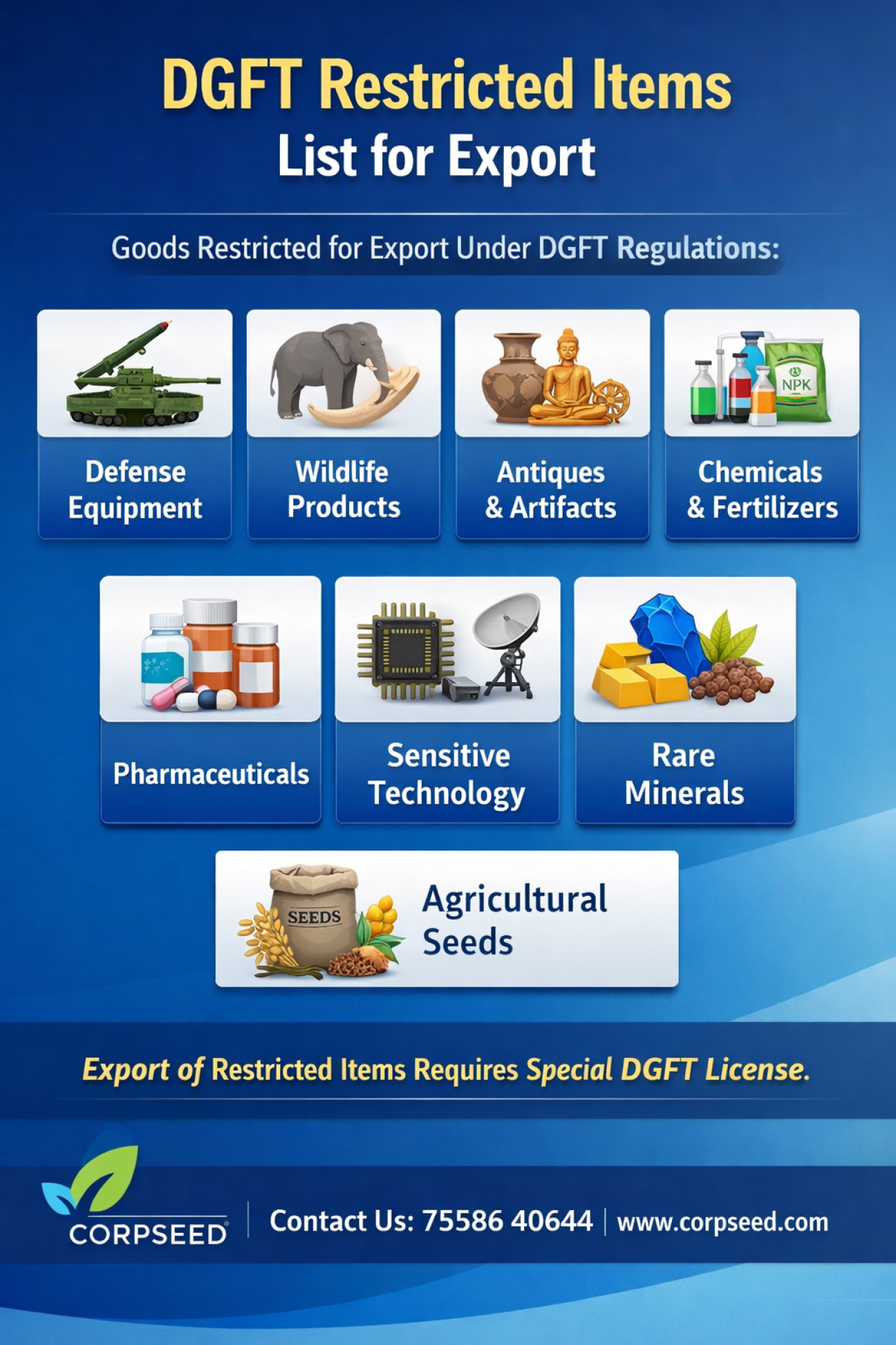 DGFT restricted items list for export includes goods that require special permission under Foreign Trade Policy. Corpseed helps exporters understand eligibility and licensing. Call 75586 40644 for guidance.