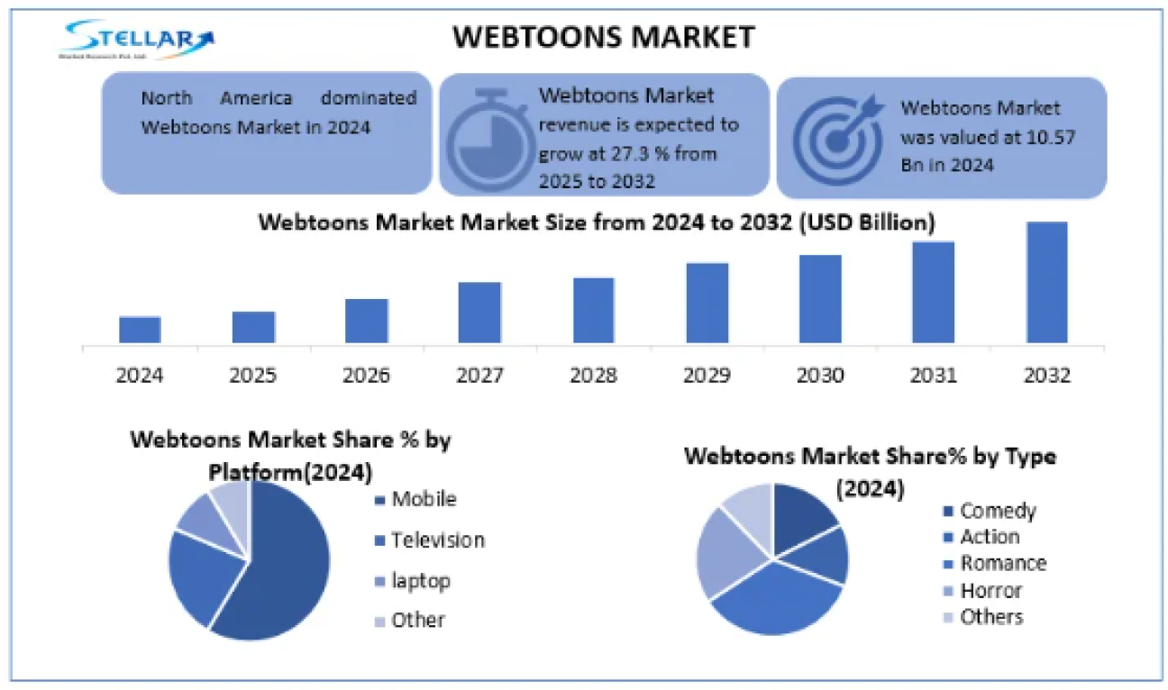 Stellar Market Research, a leading business consultancy firm, has published an in-depth analysis of the Webtoon Market, offering valuable insights and projections. This detailed study covers critical business intelligence, demand analysis, pricing strategies, competitive landscape, and key growth drivers, providing a comprehensive view of the Webtoon market's current state and its future potential.