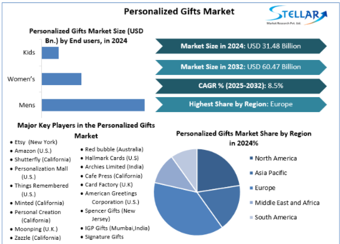 The Stellar Market Research report provides an in-depth analysis of the Personalized Gifts Market, focusing on market size, growth trends, supply chain dynamics, and competitive strategies. The report examines key elements such as value chain structure, cost factors, demand patterns, applications, revenues, product categories, and regional performance. It also evaluates recent developments, trade regulations, import-export trends, production analysis, and the influence of both global and localized market players.