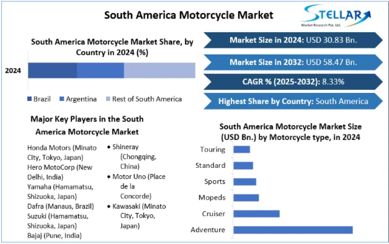 Motorcycles are widely adopted across South America due to their affordability, low maintenance costs, ease of maneuverability in congested traffic, and fuel efficiency. Market estimation conducted by Stellar Market Research evaluates current market size, historical performance, and future growth prospects across multiple segments, including motorcycle type, engine capacity, and regional markets such as Brazil, Argentina, and the rest of South America.